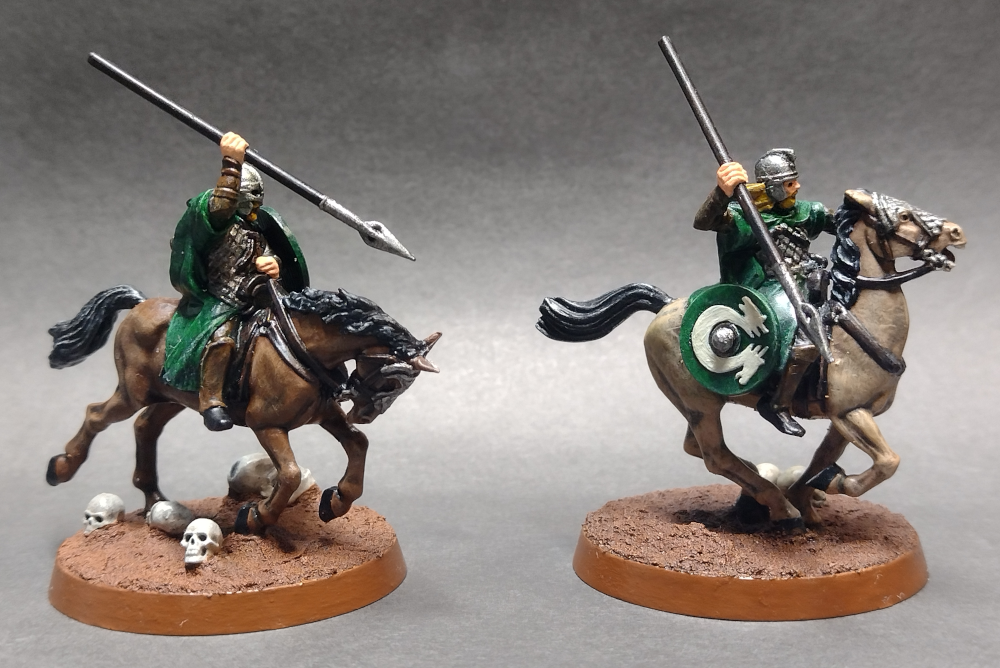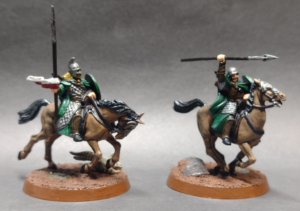 Chcę, żeby każdy jeździec w mojej armii wyglądał inaczej. Każdemu z nich robię unikalną pozę. Mam jeszcze 4 innych, ale nie miałem czasu ich pomalować. Udało mi się kupić konie jeźdźców Minas Tirith, więc w przyszłości będę zmieniał również konie. Jednemu jeźdźcowi złamała się włócznia. Kiedy ją przyklejałem zrobiłem flagę Polski. Kto wie, może w przyszłości moja armia będzie wyglądać jak Husaria ;p