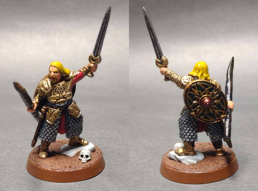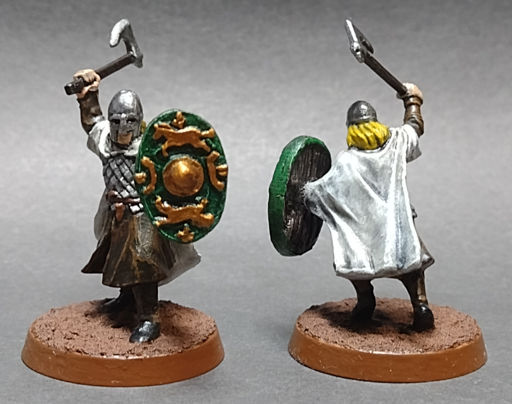 Robiłem ich ze zwykłej piechoty. Tarcze to odlewy ze szybko schnącej szpachlówki. Jeden z modeli był oryginalnie z toporem. Drugiemu przykleiłem topór, odcięty od jeźdźca Rohanu. Biała peleryna pozwala łatwo odróżnić ich od reszty armii.